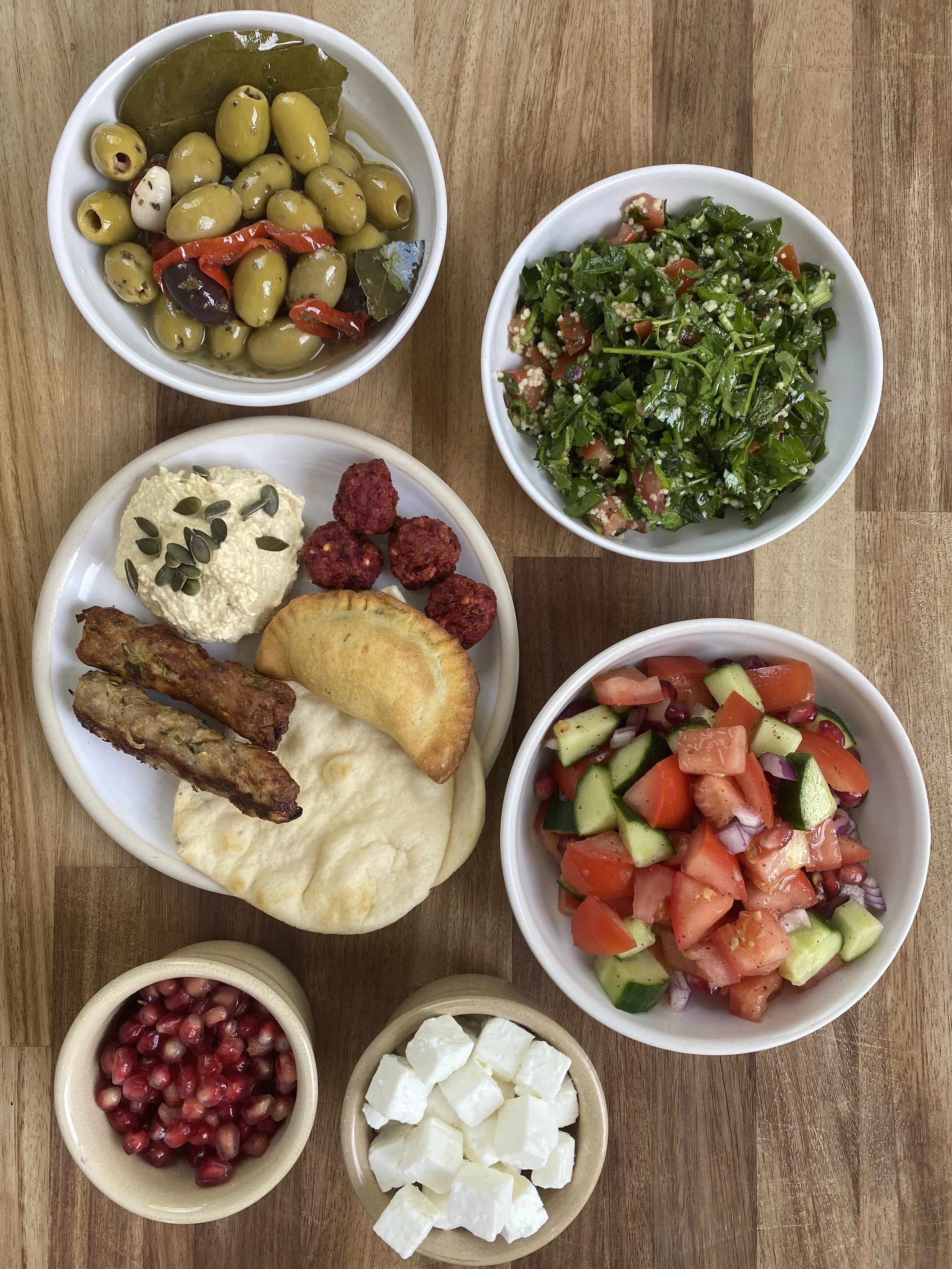 Pickled lemon & olive chicken thighs with flatbread & Greek salad